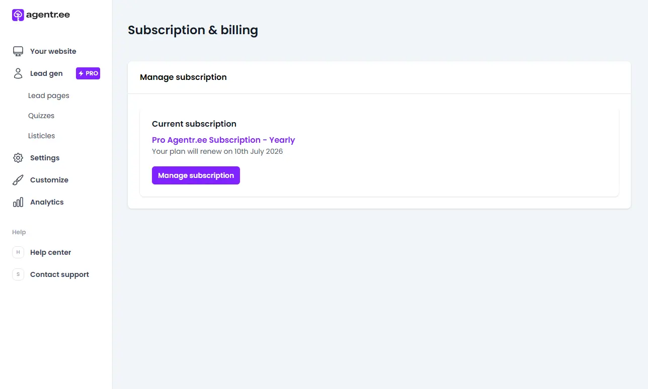 If you have any questions or need help with your billing and subscription, please email us at support@agentr.ee.